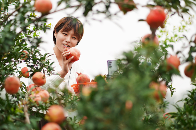 河北省邢臺(tái)市內(nèi)丘縣五郭店鄉(xiāng)東磁窯溝村農(nóng)民在石榴園通過(guò)網(wǎng)絡(luò)直播銷(xiāo)售石榴(10月2日攝)。新華社記者 朱旭東 攝