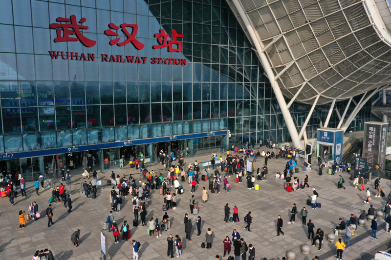 旅客在武漢火車(chē)站東廣場(chǎng)準(zhǔn)備進(jìn)站乘車(chē)(10月8日攝,無(wú)人機(jī)照片)。新華社發(fā)(趙軍攝)