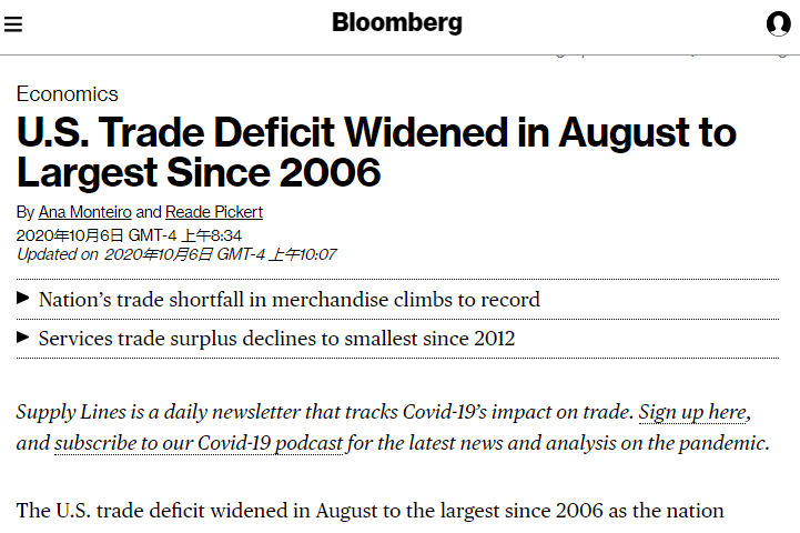 △彭博社報道:美國8月貿(mào)易逆差擴(kuò)大至2006年以來最高水平