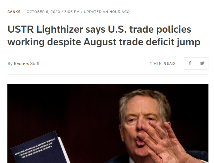 萊特希澤表示,美國8月貿(mào)易逆差擴(kuò)大是因為美國經(jīng)濟(jì)復(fù)蘇快于它的貿(mào)易伙伴,自5月以來,美國的進(jìn)出口都出現(xiàn)反彈,但是進(jìn)口復(fù)蘇的速度更快。他認(rèn)為,美國今年的貿(mào)易逆差增加主要受到金條進(jìn)口的驅(qū)使,反映的是疫情期間交易員和投資者的風(fēng)險對沖策略,而非經(jīng)濟(jì)基本面。總體而言,盡管出現(xiàn)了新冠病毒,特朗普總統(tǒng)的貿(mào)易政策正在發(fā)揮作用。