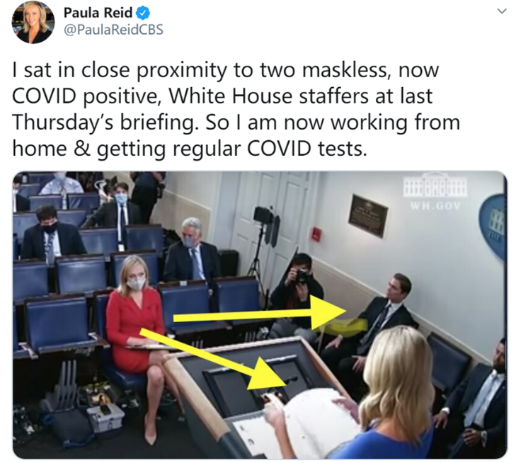 由于白宮沒有完善的密切接觸者追蹤機制,讓預防更加困難。確診的《紐約時報》記者邁克爾·希爾(Michael Shear)到現(xiàn)在都不能確定自己在哪里感染了病毒。希爾在9月26日報道了特朗普在賓夕法尼亞州的集會,并乘坐空軍一號返回,特朗普在飛機上對記者們發(fā)表了講話,但沒有戴口罩。讓他驚訝的是,白宮竟然沒人聯(lián)系他,對他的密切接觸者進行排查。