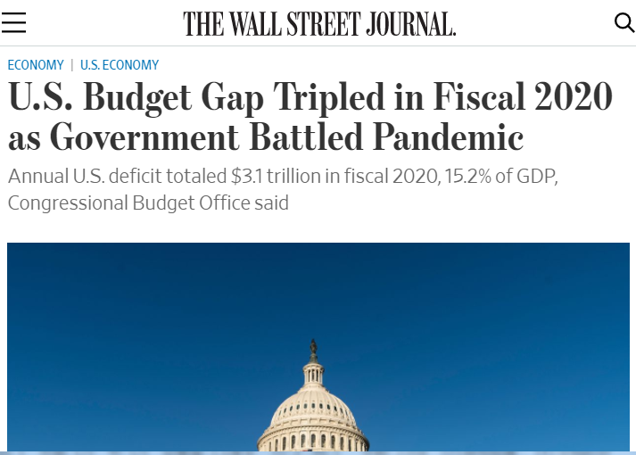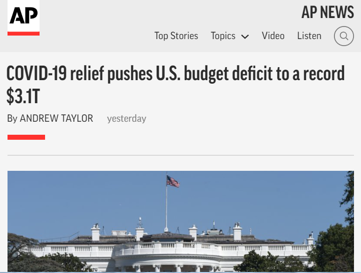 △美聯(lián)社稱,疫情救助措施將美國預算赤字推至創(chuàng)紀錄的3.1萬億美元