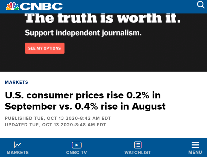 △CNBC報(bào)道,美國(guó)9月消費(fèi)者價(jià)格上漲0.2%,漲幅不及8月的0.4%