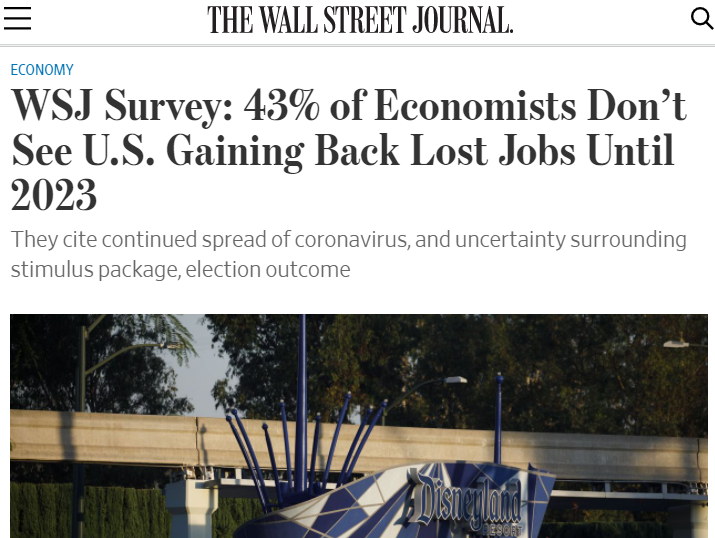 當(dāng)前,美國(guó)經(jīng)濟(jì)復(fù)蘇乏力已成共識(shí)。《華爾街日?qǐng)?bào)》針對(duì)經(jīng)濟(jì)學(xué)家進(jìn)行的一項(xiàng)最新調(diào)查顯示,超過(guò)一半的人表示,他們預(yù)計(jì)勞動(dòng)力市場(chǎng)要到2023年或更晚才會(huì)完全復(fù)蘇,這比6個(gè)月前預(yù)測(cè)的復(fù)蘇步伐更為悲觀。而隨著更多的永久性裁員出現(xiàn),就業(yè)增長(zhǎng)在進(jìn)入秋季后大幅放緩,進(jìn)一步顯示經(jīng)濟(jì)復(fù)蘇還需要很長(zhǎng)一段時(shí)間。
