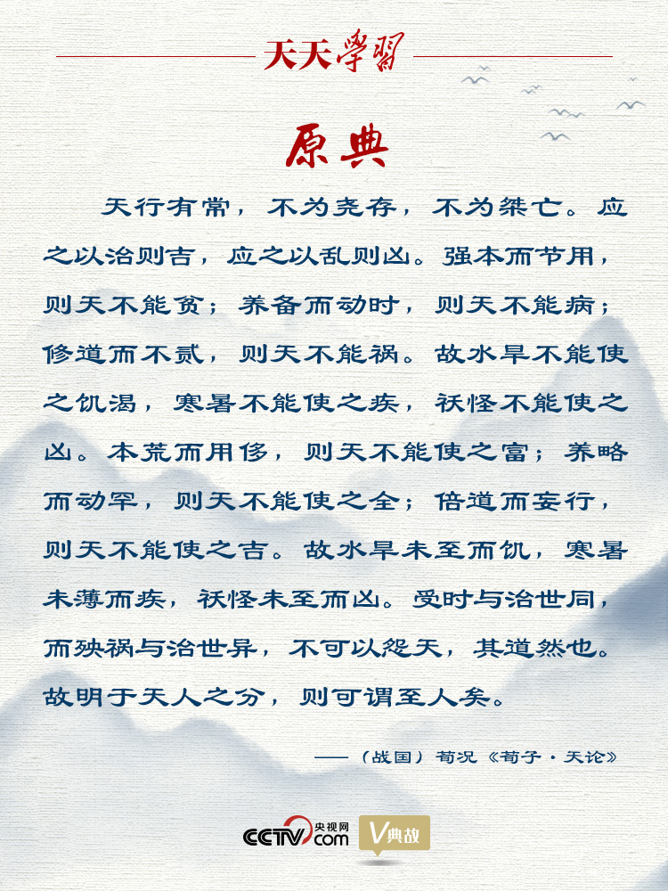 “天行有!,“應(yīng)之以治則吉”,出自《荀子·天論》開篇首句“天行有常,不為堯存,不為桀亡。應(yīng)之以治則吉,應(yīng)之以亂則兇!痹牡囊馑际牵捍笞匀挥凶约旱倪\(yùn)行規(guī)律,這個規(guī)律不會因?yàn)閳虻馁t明而存在,也不會因?yàn)殍畹谋┡岸觥S煤侠淼姆椒☉?yīng)對它,就會帶來吉祥的結(jié)果;用不合理的方法應(yīng)對它,就會招致災(zāi)禍。