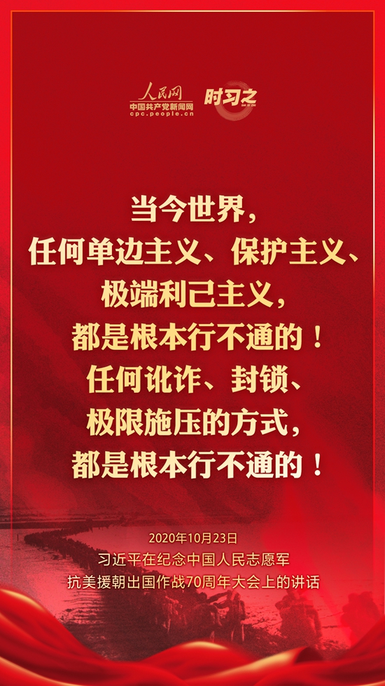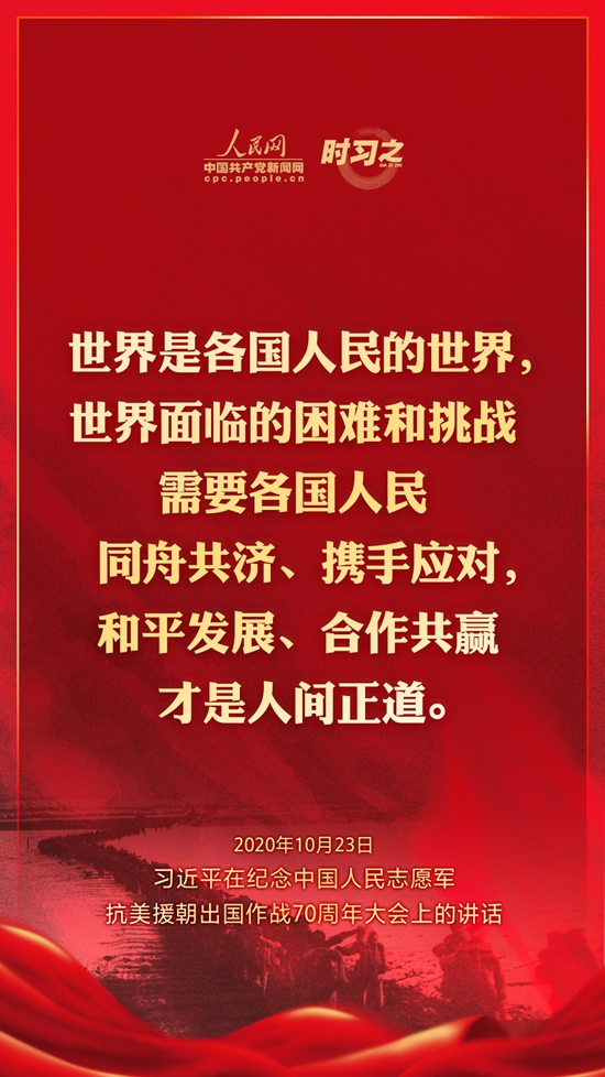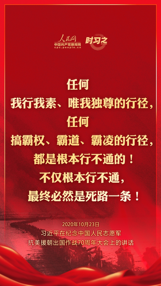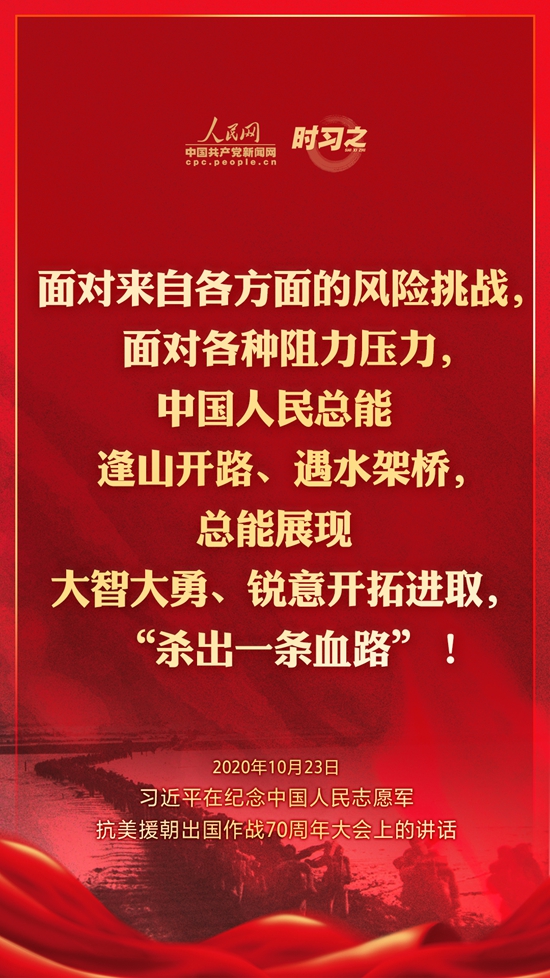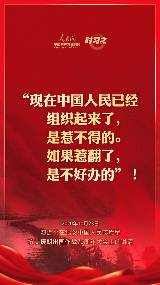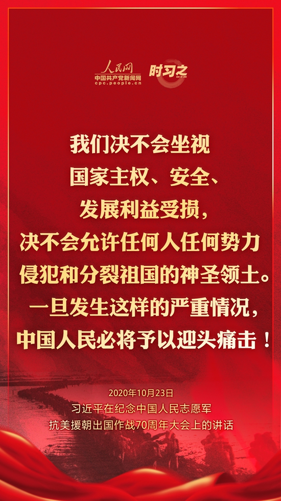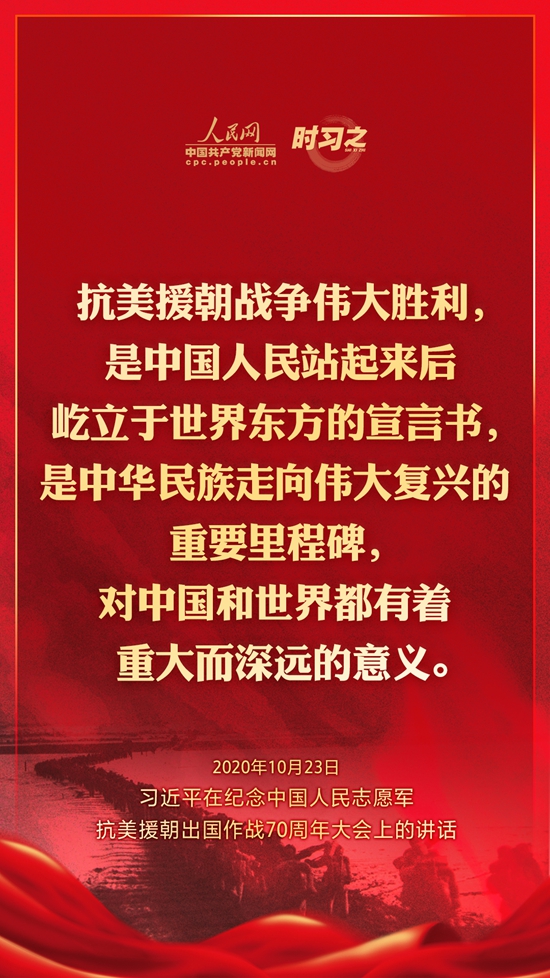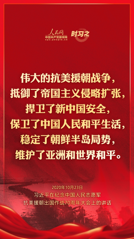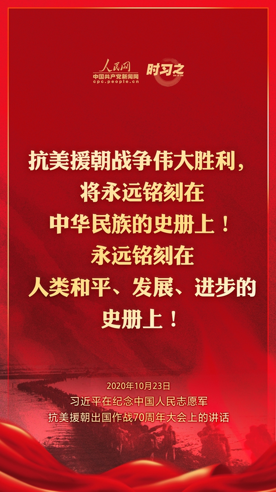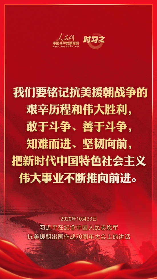 10月23日上午10時(shí),紀(jì)念中國(guó)人民志愿軍抗美援朝出國(guó)作戰(zhàn)70周年大會(huì)在北京人民大會(huì)堂隆重舉行。中共中央總書記、國(guó)家主席、中央軍委主席習(xí)近平出席大會(huì)并發(fā)表重要講話。在講話中,習(xí)近平總書記全面回顧總結(jié)了抗美援朝戰(zhàn)爭(zhēng)的偉大勝利和巨大貢獻(xiàn),深刻闡述了抗美援朝精神的歷史意義和時(shí)代價(jià)值,精辟揭示了抗美援朝戰(zhàn)爭(zhēng)的歷史啟示,鄭重宣示了捍衛(wèi)國(guó)家領(lǐng)土主權(quán)和統(tǒng)一、維護(hù)地區(qū)和世界和平穩(wěn)定、推動(dòng)構(gòu)建人類命運(yùn)共同體的堅(jiān)定立場(chǎng)和決心,強(qiáng)調(diào)要銘記偉大勝利,敢于斗爭(zhēng)、善于斗爭(zhēng),把中國(guó)特色社會(huì)主義偉大事業(yè)不斷推向前進(jìn)。人民網(wǎng)·中國(guó)共產(chǎn)黨新聞網(wǎng)“時(shí)習(xí)之”欄目制作了12張海報(bào),帶您一起回顧總書記鏗鏘有力的話語(yǔ)。
