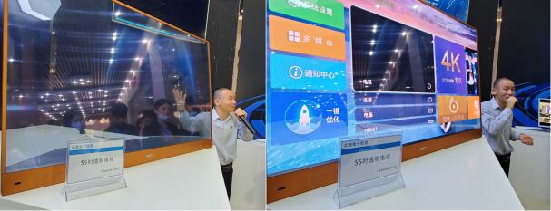 惠科科技有限公司55吋透明電視,關機時是一塊透明玻璃(左),開機是一塊可以播放影像的屏幕(右)。