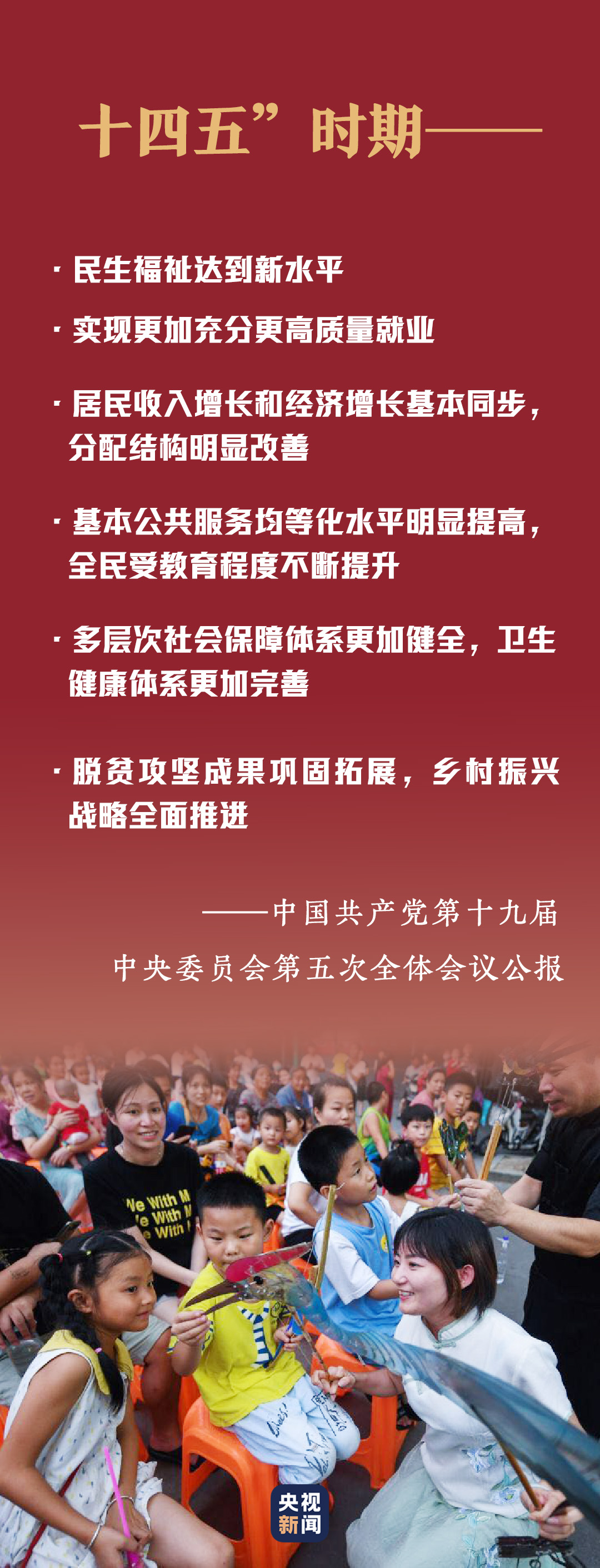 十九屆五中全會(huì)提出,不斷增強(qiáng)人民群眾獲得感、幸福感、安全感,促進(jìn)人的全面發(fā)展和社會(huì)全面進(jìn)步!耙詽M足人民日益增長的美好生活需要為根本目的”“堅(jiān)持以人民為中心,堅(jiān)持新發(fā)展理念,堅(jiān)持深化改革開放,堅(jiān)持系統(tǒng)觀念”“改善人民生活品質(zhì),提高社會(huì)建設(shè)水平”......