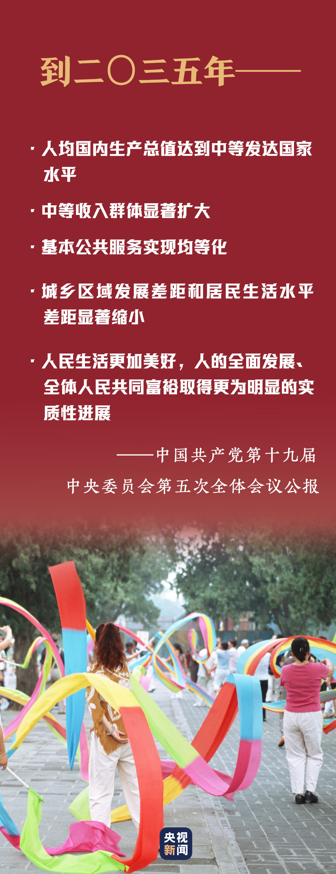 十九屆五中全會(huì)提出到二〇三五年基本實(shí)現(xiàn)社會(huì)主義現(xiàn)代化遠(yuǎn)景目標(biāo)。到那時(shí),人民生活更加美好,人的全面發(fā)展、全體人民共同富裕取得更為明顯的實(shí)質(zhì)性進(jìn)展。