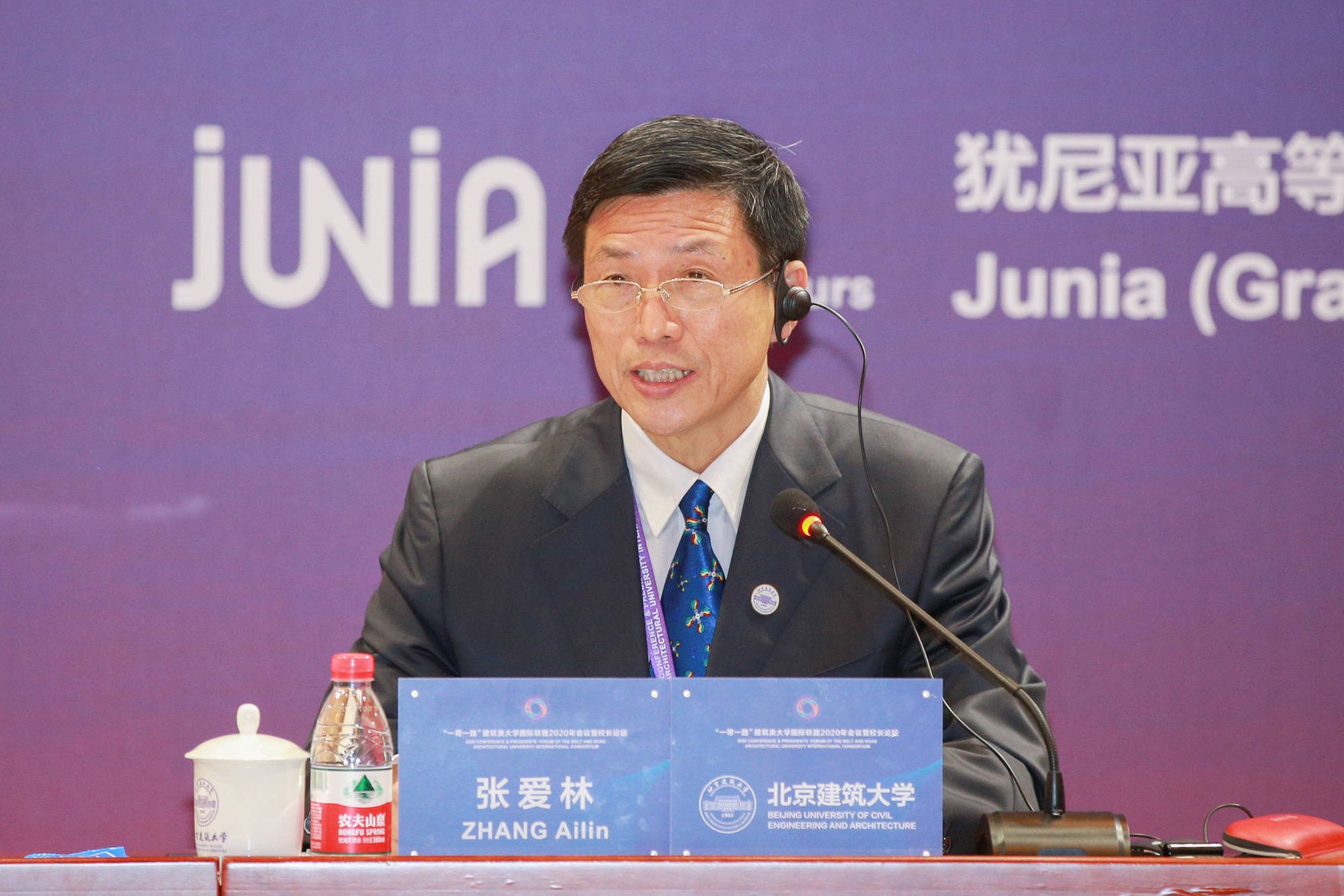 “一帶一路”建筑類大學(xué)國際聯(lián)盟主席、北京建筑大學(xué)校長張愛林在會上發(fā)言。北京建筑大學(xué)提供