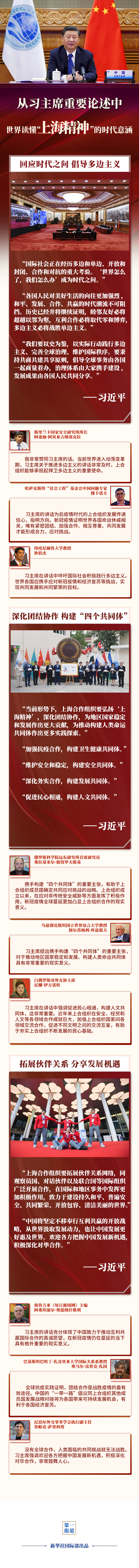 習(xí)主席的講話引發(fā)國(guó)際社會(huì)積極反響。多國(guó)專家學(xué)者表示,習(xí)主席的重要論述為上合組織的發(fā)展指明方向,豐富“上海精神”的時(shí)代意涵,為推動(dòng)構(gòu)建更加緊密的命運(yùn)共同體注入強(qiáng)大動(dòng)力--