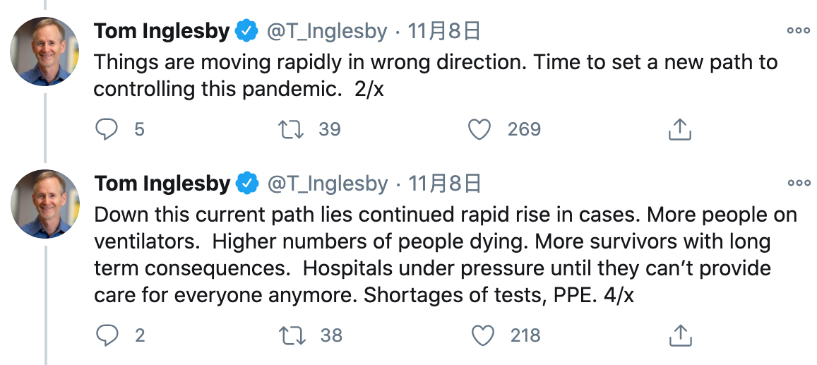 約翰斯·霍普金斯大學(xué)健康衛(wèi)生安全中心主任湯姆·英格斯比在社交媒體上發(fā)文稱:“照目前的趨勢來看,美國確診病例數(shù)將持續(xù)激增,死亡病例數(shù)也將增加。醫(yī)院將承受越來越大的壓力,直到它們超負(fù)荷運(yùn)轉(zhuǎn),無法再為病人提供治療。”