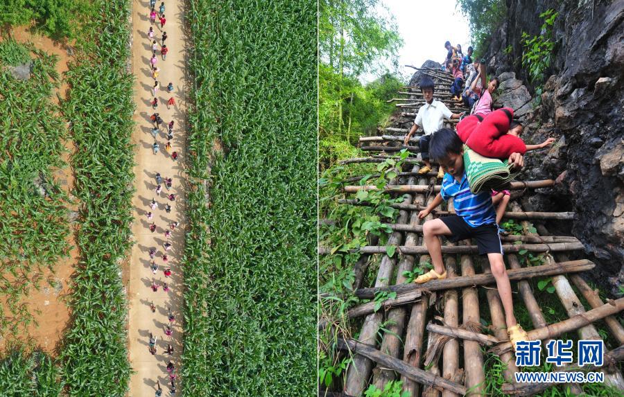 這是一張拼版照片。左圖:在大化瑤族自治縣板升鄉(xiāng)弄勇村,孩子們走在放學(xué)路上(2019年5月10日攝,無人機(jī)照片);右圖:在弄勇村弄頂屯,孩子們扛著生活用具,爬懸梯上學(xué)(2012年9月3日攝)。目前,弄勇村所有的屯都已告別沒有公路的歷史。新華社記者 黃孝邦 攝