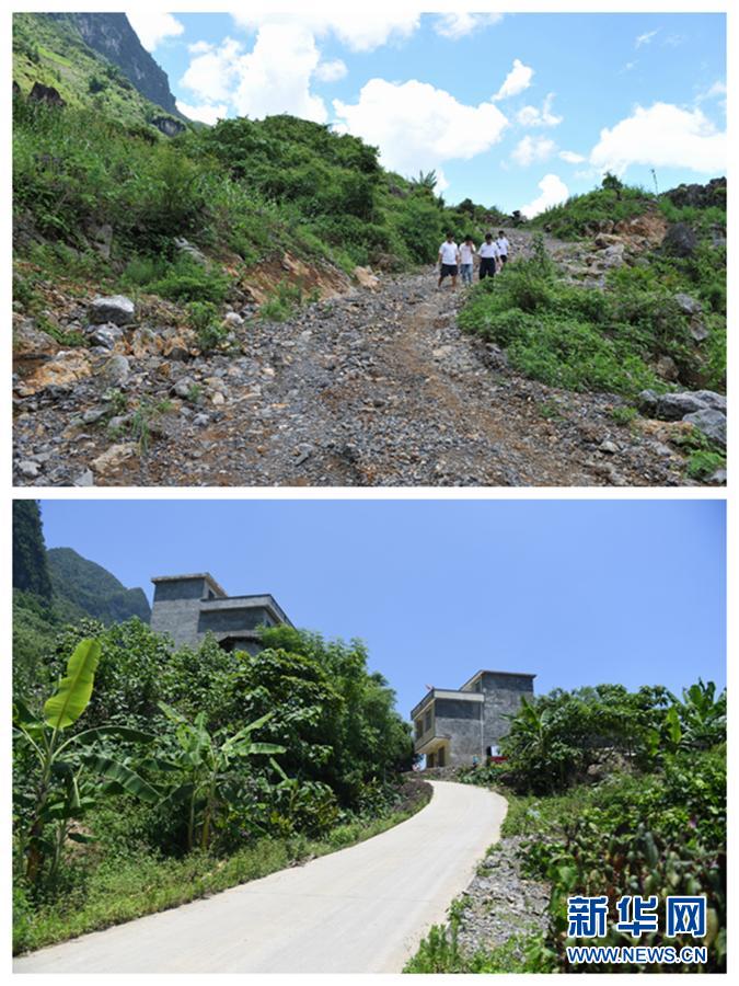 這是一張拼版照片:上圖:廣西那坡縣邊境零公里線上甲柳村上保屯的進(jìn)屯路(2009年7月14日攝);下圖:甲柳村上保屯現(xiàn)在的道路(2018年6月7日攝)。新華社記者 張愛林 攝