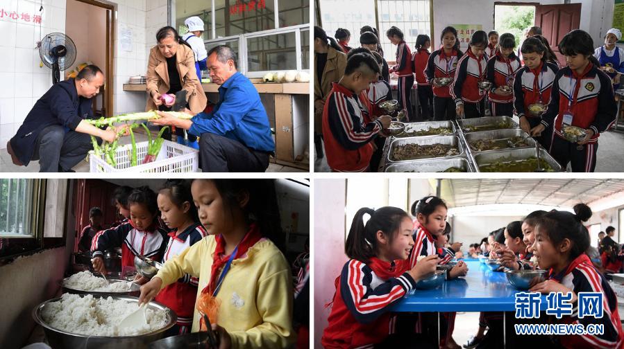這是一張拼版照片。上左:在融水苗族自治縣東陽村小學(xué),廚房師傅們在準(zhǔn)備營養(yǎng)午餐;上右:東陽村小學(xué)學(xué)生根據(jù)需要挑選菜肴。下左:東陽村小學(xué)學(xué)生排隊(duì)打飯;下右:東陽村小學(xué)學(xué)生在食用營養(yǎng)午餐。近年來,廣西在貧困地區(qū)大力推行學(xué)生營養(yǎng)餐,幫助貧困學(xué)生健康成長(2019年5月6日攝)。新華社記者 張愛林 攝
