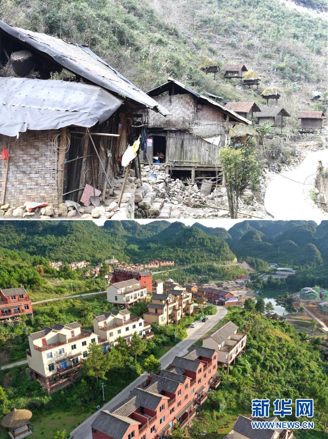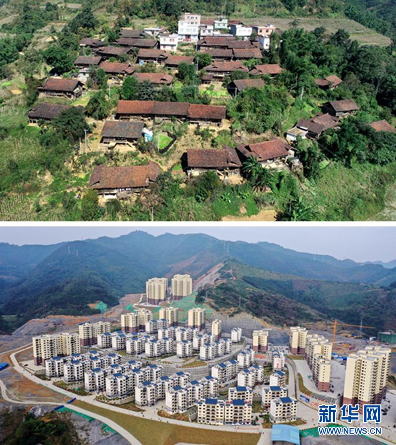 這是一張拼版照片。上圖:廣西百色市隆林各族自治縣金鐘山鄉(xiāng)平流村坡安屯群眾搬遷前的住房(2017年7月21日攝,無人機(jī)照片);下圖:平流村坡安屯群眾搬遷到安置點(diǎn)的新住房(2019年12月3日攝)。新華社記者 張愛林 攝