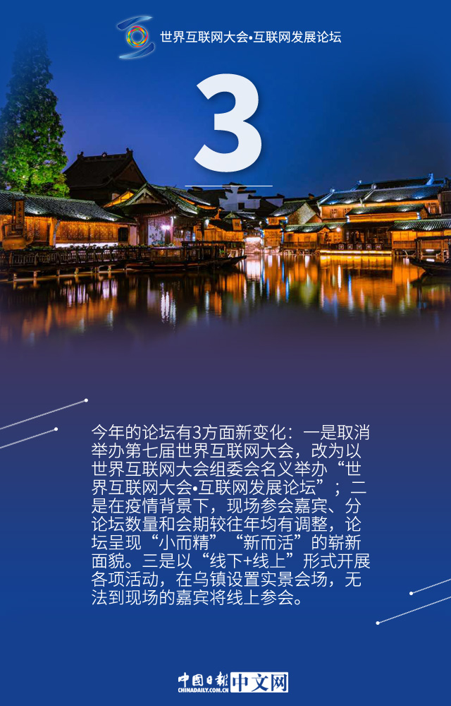 中國(guó)日?qǐng)?bào)網(wǎng)11月23日電 11月23日至24日,以“數(shù)字賦能 共創(chuàng)未來(lái)——攜手構(gòu)建網(wǎng)絡(luò)空間命運(yùn)共同體”為主題的“世界互聯(lián)網(wǎng)大會(huì)·互聯(lián)網(wǎng)發(fā)展論壇”將在浙江烏鎮(zhèn)舉辦。今年的論壇有哪些亮點(diǎn)以及不同之處,讓我們通過(guò)一組數(shù)字了解。