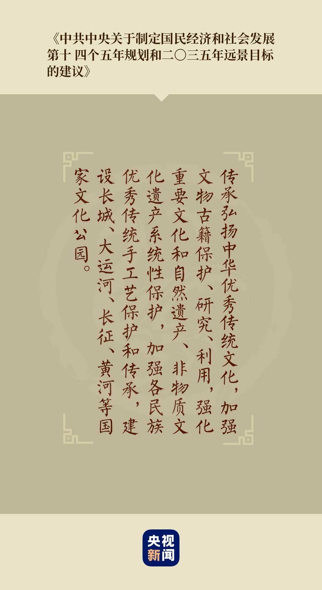 黨的十九屆五中全會(huì)審議通過(guò)的《中共中央關(guān)于制定國(guó)民經(jīng)濟(jì)和社會(huì)發(fā)展第十四個(gè)五年規(guī)劃和二〇三五年遠(yuǎn)景目標(biāo)的建議》,提出“繁榮發(fā)展文化事業(yè)和文化產(chǎn)業(yè),提高國(guó)家文化軟實(shí)力”的目標(biāo)任務(wù)。