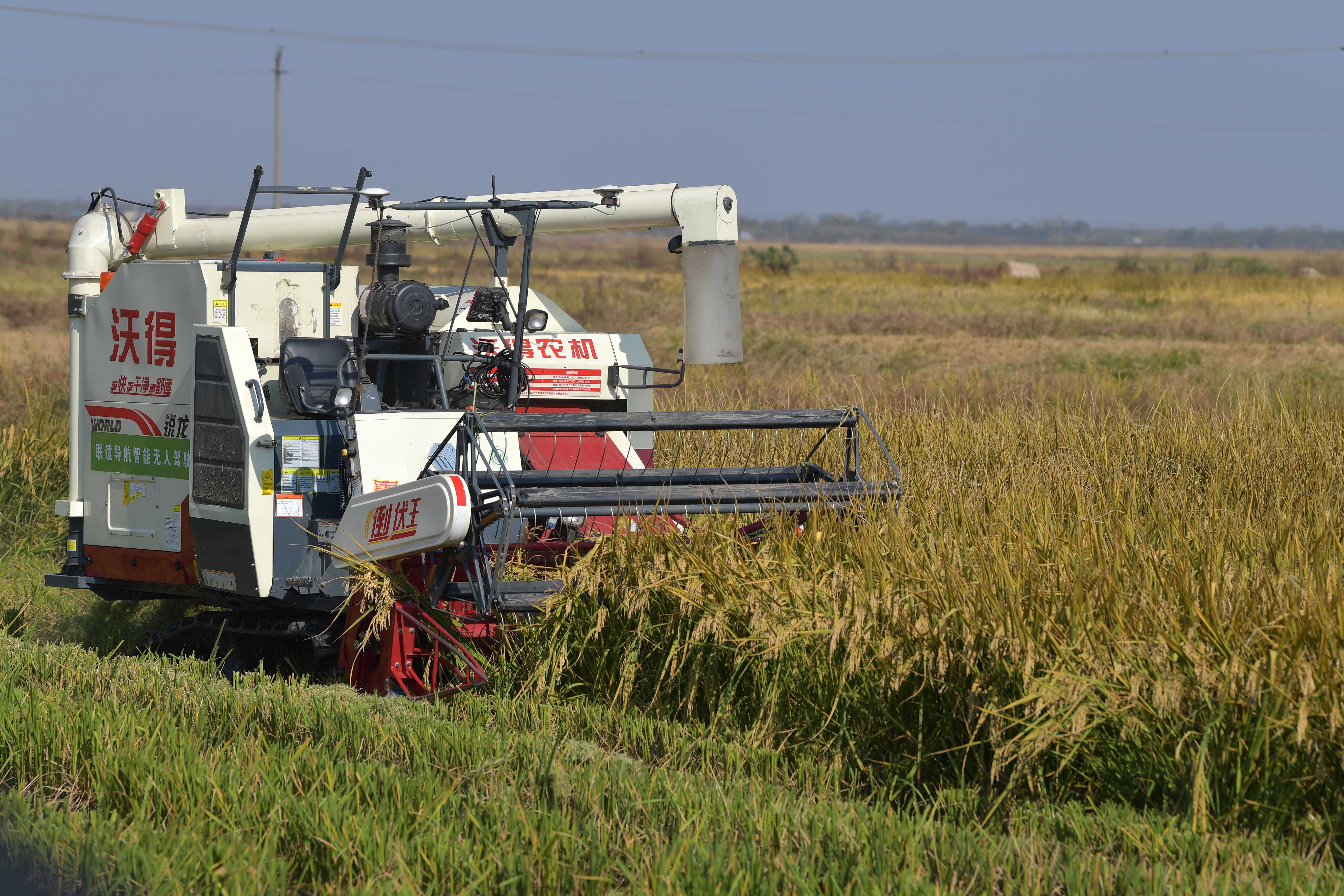 11月14日,在江西省南昌縣蔣巷鎮(zhèn)大田農(nóng)社智慧農(nóng)場,無人收割機(jī)在現(xiàn)場演示水稻收割。