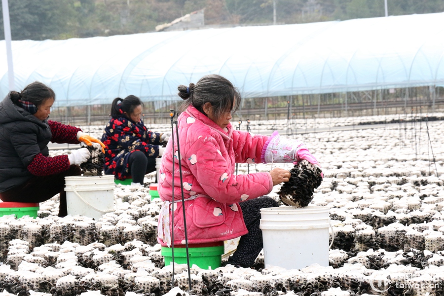 馬腦村村民李淑霞正在進(jìn)行木耳采摘。(中國(guó)臺(tái)灣網(wǎng) 尹賽楠 攝)