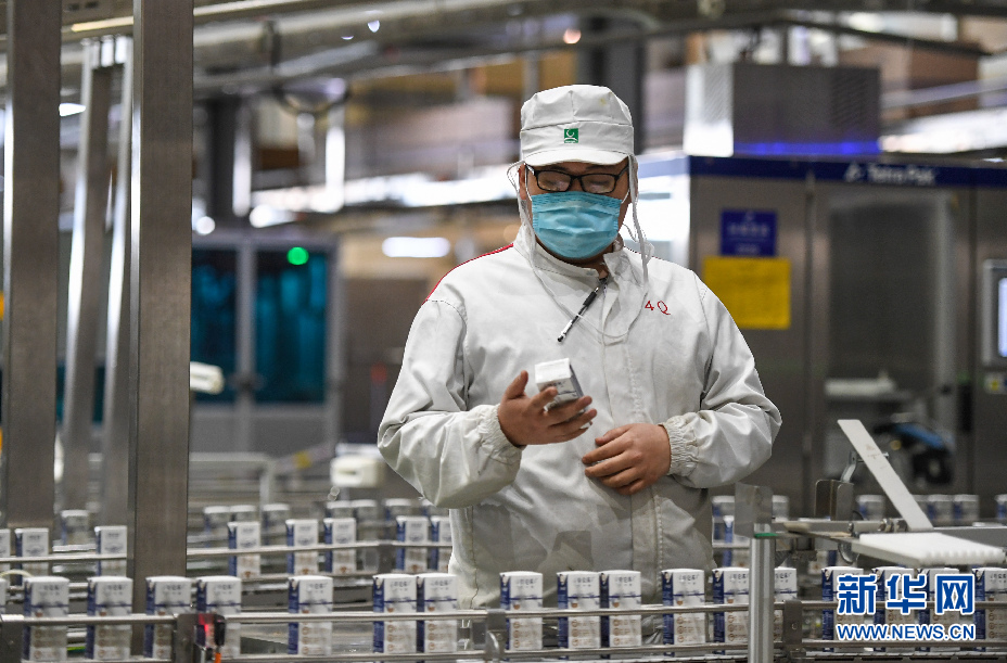 3月19日,技術人員在呼和浩特市蒙牛圣牧高科乳品有限公司的生產(chǎn)車間內(nèi)檢查產(chǎn)品的包裝情況。新華社記者 彭源 攝