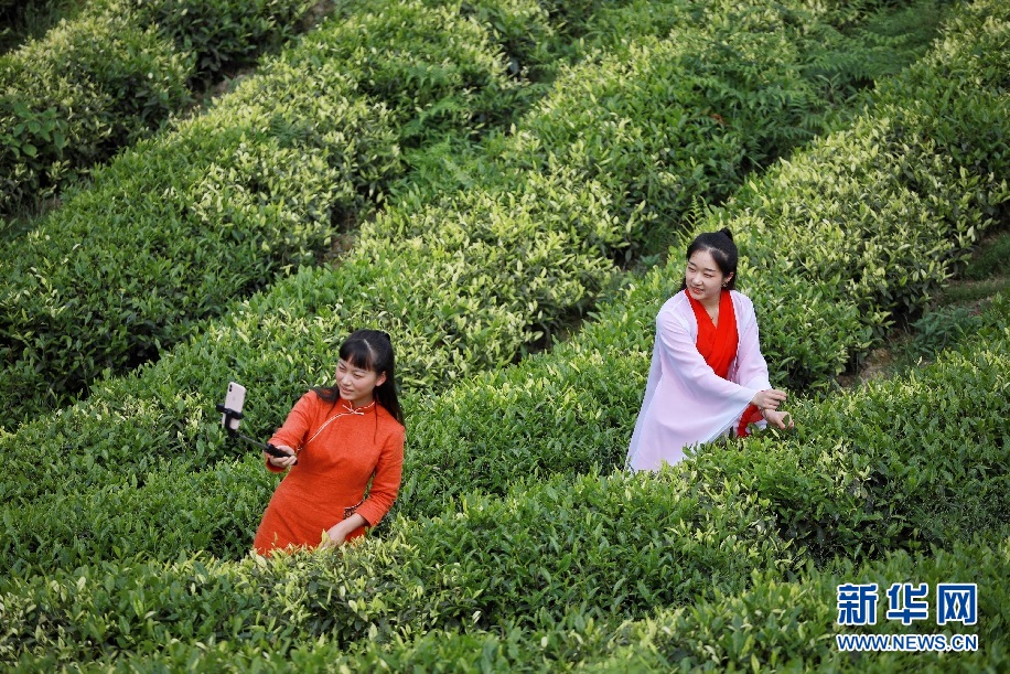 4月30日,網(wǎng)絡主播毛華艷(右)在貴州省余慶縣白泥鎮(zhèn)春景村郊外的茶園直播,助推山區(qū)茶葉銷售。新華社記者 劉續(xù) 攝