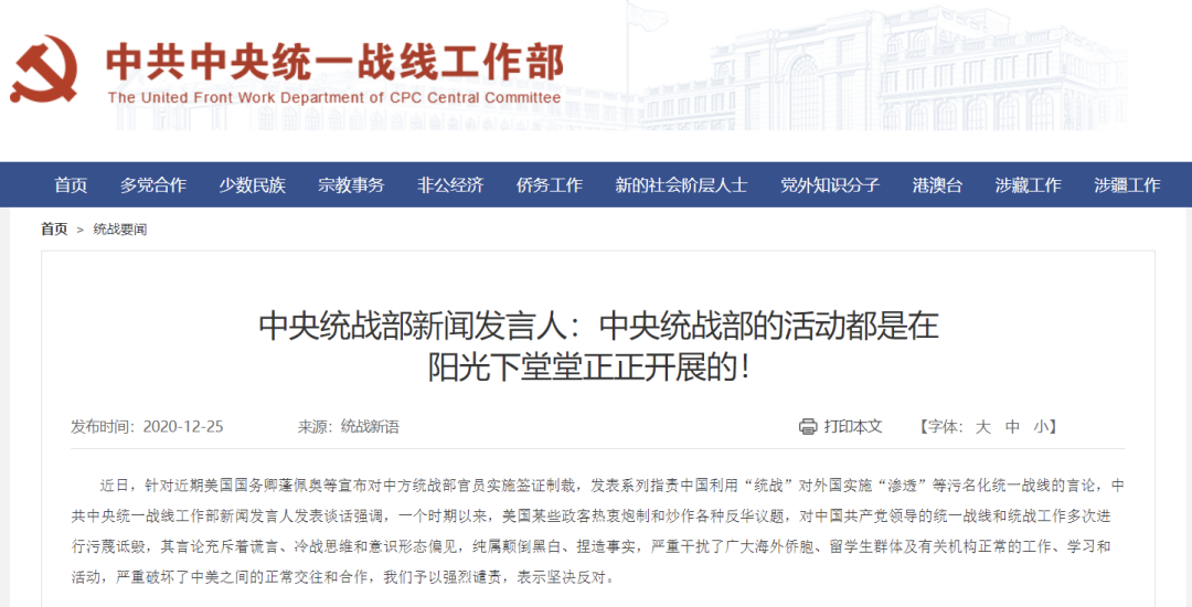 近日,針對(duì)近期美國(guó)國(guó)務(wù)卿蓬佩奧等宣布對(duì)中方統(tǒng)戰(zhàn)部官員實(shí)施簽證制裁,發(fā)表系列指責(zé)中國(guó)利用“統(tǒng)戰(zhàn)”對(duì)外國(guó)實(shí)施“滲透”等污名化統(tǒng)一戰(zhàn)線(xiàn)的言論,中共中央統(tǒng)一戰(zhàn)線(xiàn)工作部新聞發(fā)言人發(fā)表談話(huà)強(qiáng)調(diào),一個(gè)時(shí)期以來(lái),美國(guó)某些政客熱衷炮制和炒作各種反華議題,對(duì)中國(guó)共產(chǎn)黨領(lǐng)導(dǎo)的統(tǒng)一戰(zhàn)線(xiàn)和統(tǒng)戰(zhàn)工作多次進(jìn)行污蔑詆毀,其言論充斥著謊言、冷戰(zhàn)思維和意識(shí)形態(tài)偏見(jiàn),純屬顛倒黑白、捏造事實(shí),嚴(yán)重干擾了廣大海外僑胞、留學(xué)生群體及有關(guān)機(jī)構(gòu)正常的工作、學(xué)習(xí)和活動(dòng),嚴(yán)重破壞了中美之間的正常交往和合作,我們予以強(qiáng)烈譴責(zé),表示堅(jiān)決反對(duì)。