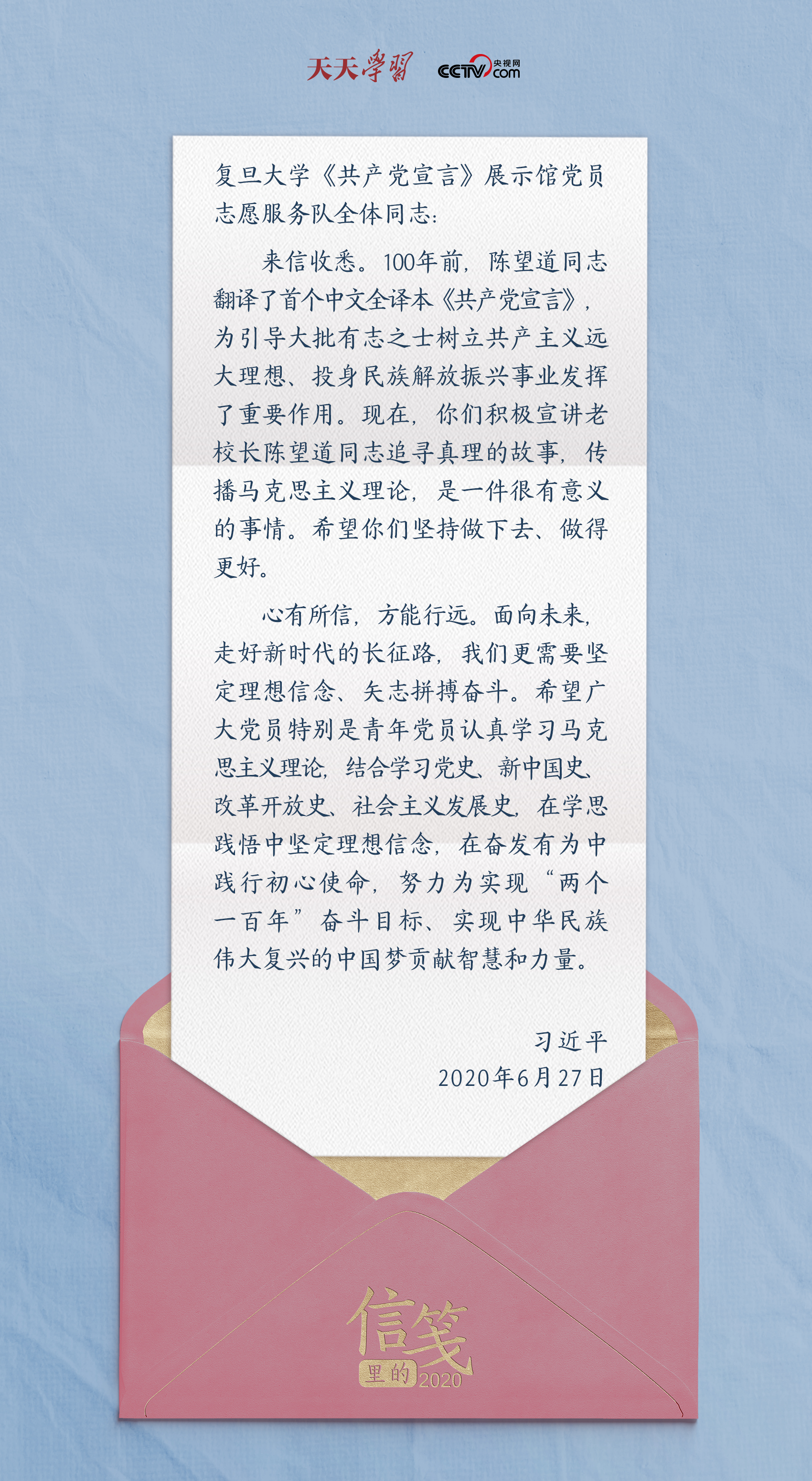 今年夏天,黨員志愿服務(wù)隊(duì)的30名隊(duì)員給習(xí)近平總書記寫了封信,匯報(bào)了參加志愿講解服務(wù)的經(jīng)歷和體會,并表達(dá)了做《共產(chǎn)黨宣言》精神忠實(shí)傳人的信心和決心。
