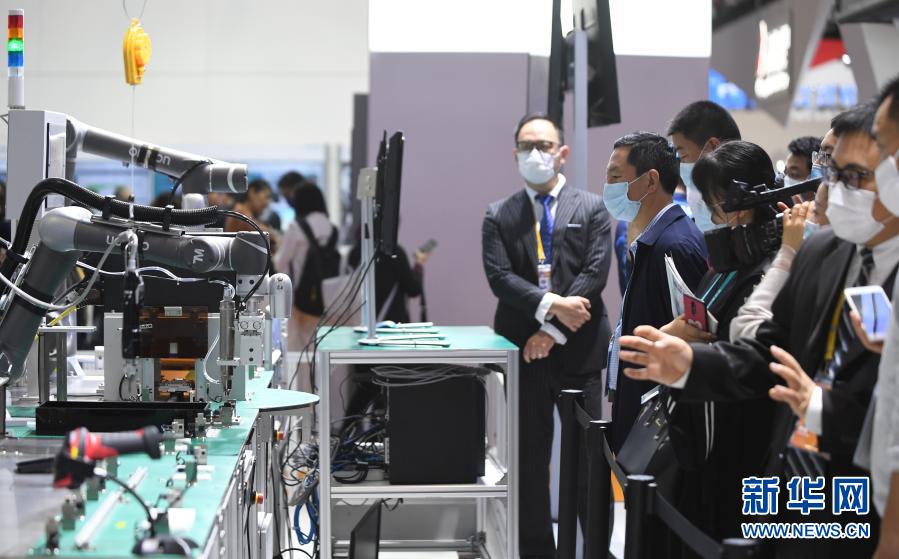 2020年11月6日,在進(jìn)博會(huì)技術(shù)裝備展區(qū),人們?cè)谖鏖T(mén)子展臺(tái)觀看人機(jī)協(xié)作的智能化單元生產(chǎn)線。新華社記者 李任滋 攝