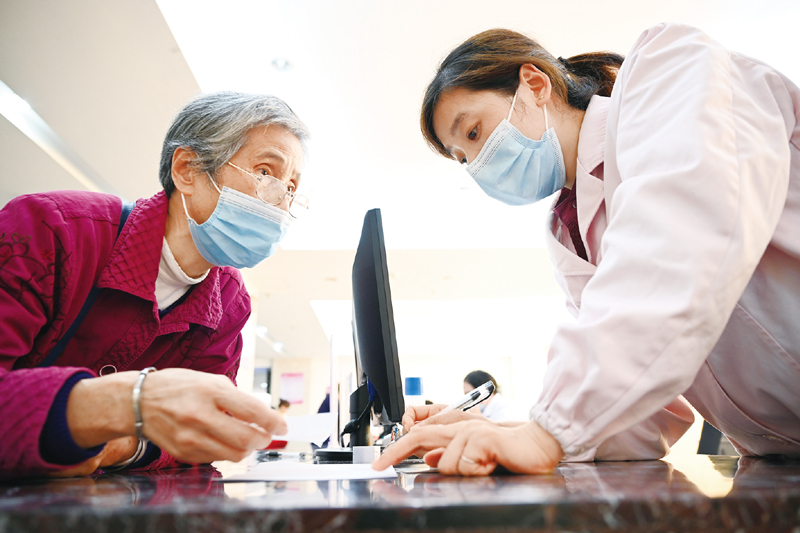 2012年以來,三明市勇于涉“深水區(qū)”、敢于啃“硬骨頭”,闖出了一條破解醫(yī)改難題的新路子。圖為福建省三明市第一醫(yī)院的醫(yī)保辦工作人員(右)向前來咨詢藥品報(bào)銷問題的居民講解相關(guān)政策。 新華社記者 姜克紅/攝