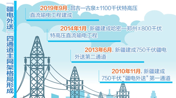 2010年,“疆電外送”的序幕緩緩拉開。當(dāng)年11月,新疆建成“疆電外送”第一通道——哈密至敦煌750千伏輸變電工程,實現(xiàn)了新疆并入全國電網(wǎng);2013年6月,750千伏第二通道建成投運;2014年1月,哈密—鄭州±800千伏特高壓直流輸電工程投運,“疆電外送”第三通道建成。