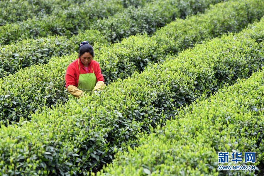 金寨縣花石鄉(xiāng)大灣村村民在茶產(chǎn)業(yè)扶貧基地里采茶(2020年4月17日攝)。新華社記者劉軍喜攝