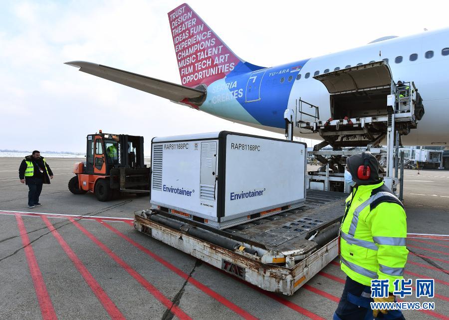 1月16日,在塞爾維亞首都貝爾格萊德,機場工作人員卸載首批100萬劑由中國國藥集團生產(chǎn)的新冠疫苗。新華社發(fā)(普雷德拉格·米洛薩夫列維奇 攝)