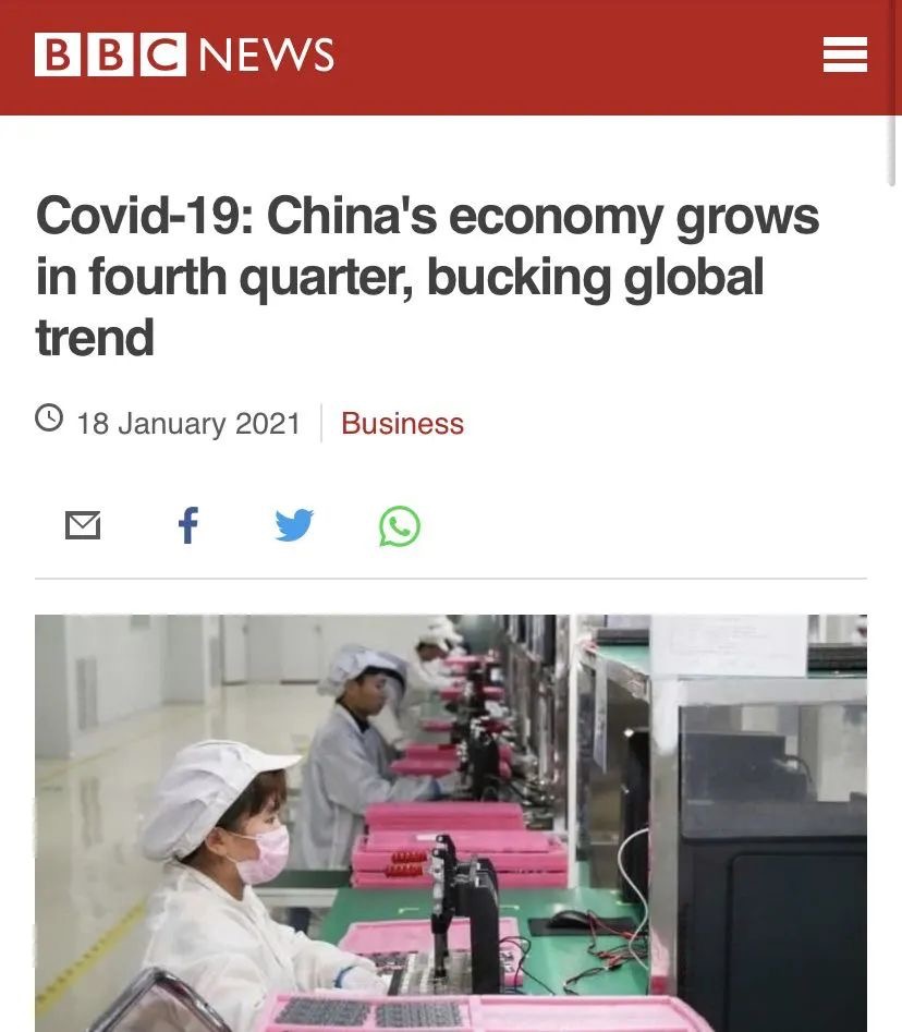 報道說,雖然全球其他主要經(jīng)濟體經(jīng)濟萎縮,但2020年第四季度中國經(jīng)濟增速超過了疫情前的水平,中國經(jīng)濟的全年增速也超過預(yù)期。