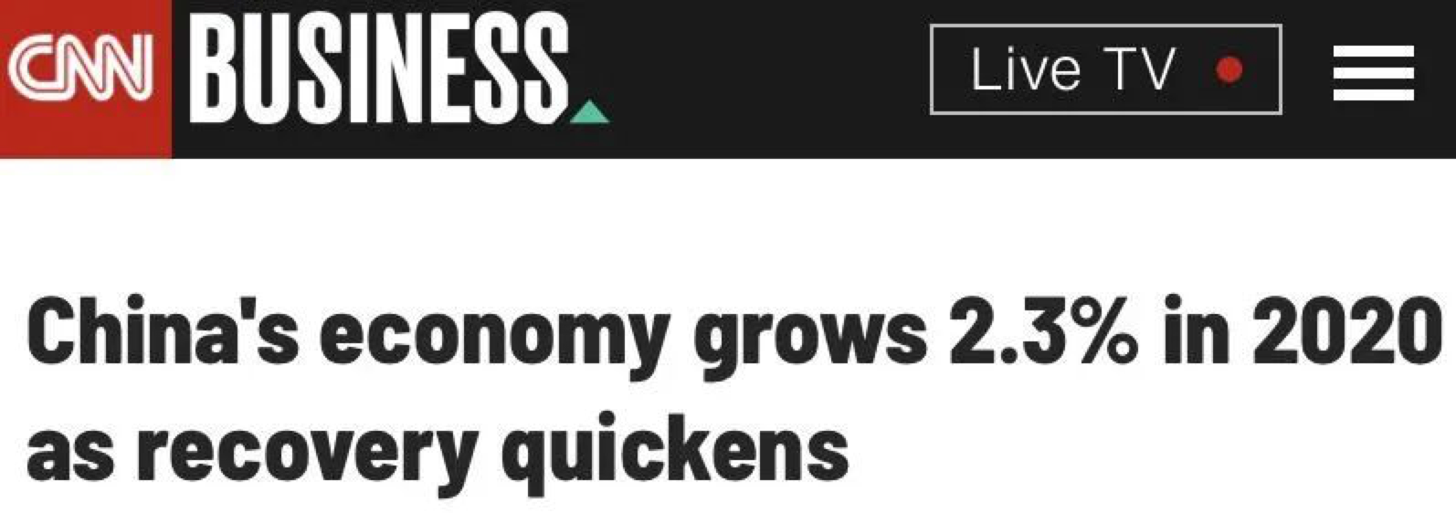美國有線電視新聞網(wǎng)(CNN)第一時間關(guān)注了中國2020年GDP同比增長2.3%。