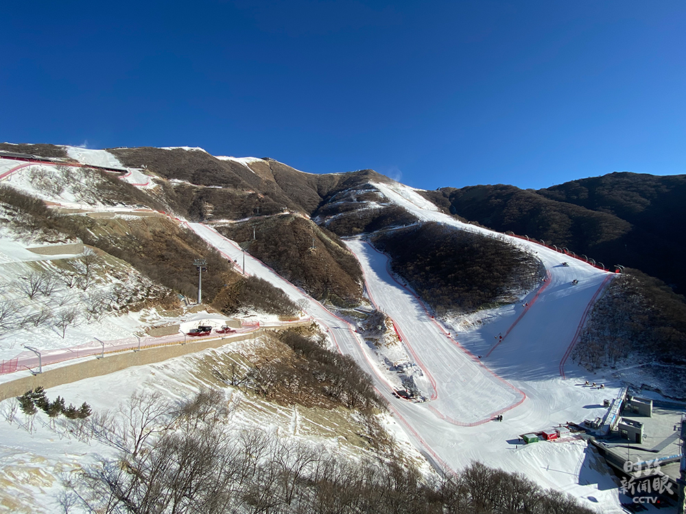 △國家高山滑雪中心的雪道系統(tǒng)共設(shè)7條雪道,3條用于競賽,4條作為訓(xùn)練,總長9.2公里,其中滑降賽道落差近900米。(總臺(tái)央視記者楊立峰拍攝)