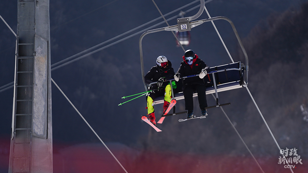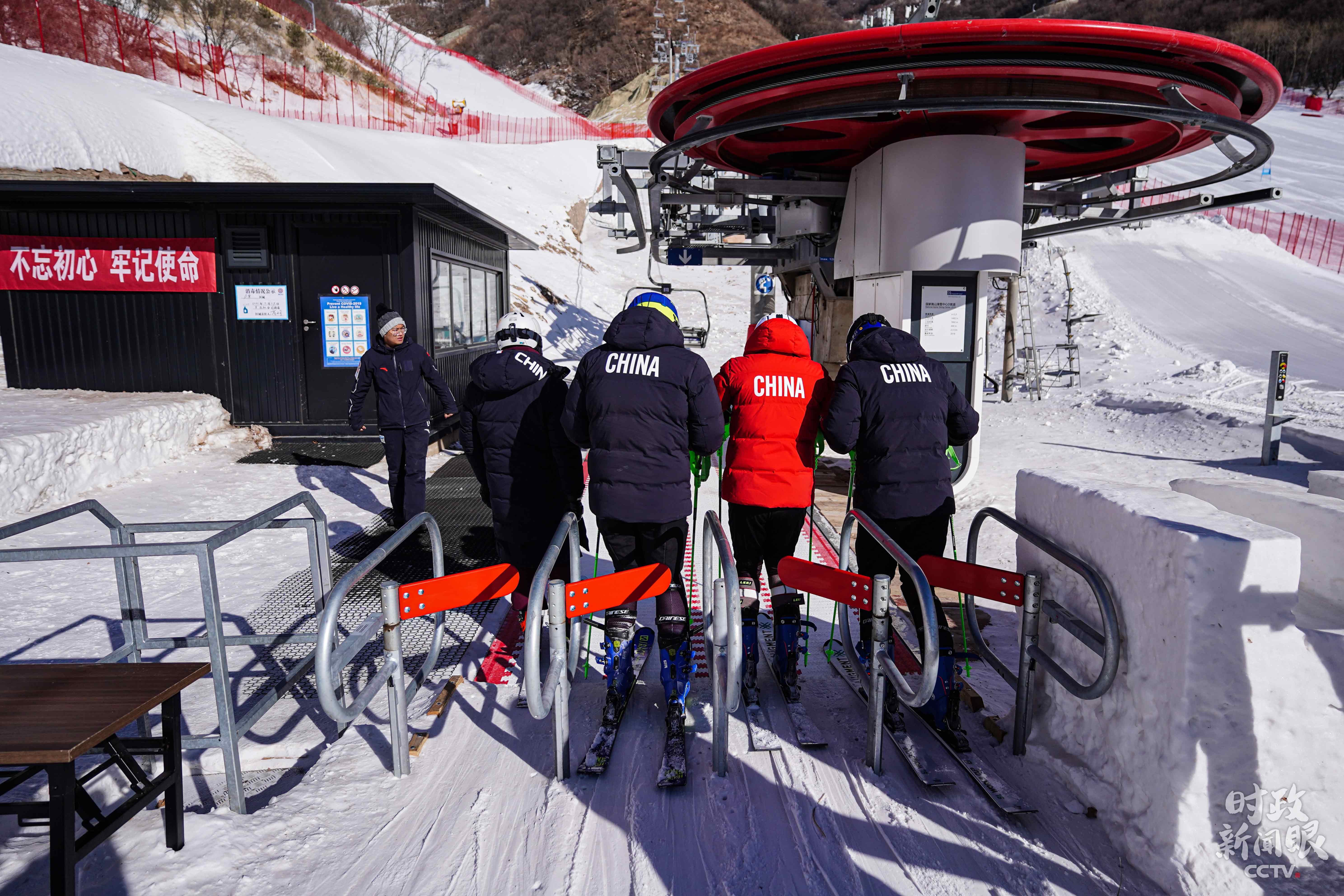 △國家高山滑雪隊(duì)員準(zhǔn)備搭乘纜車上訓(xùn)練賽道。(總臺(tái)國廣記者李晉拍攝)