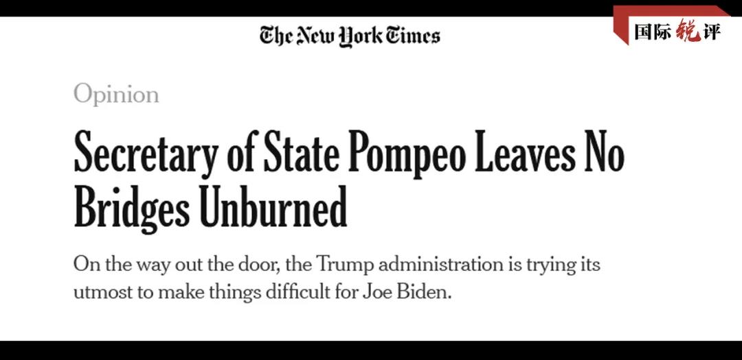 他的這番表演想給誰(shuí)看?其實(shí)并不難猜。不少美媒分析說(shuō),蓬佩奧正試圖通過(guò)“外交閃電戰(zhàn)”來(lái)牽制下任美國(guó)政府!都~約時(shí)報(bào)》形容蓬佩奧正在燒毀每一座橋并留下無(wú)數(shù)爛攤子。美國(guó)《外交政策》稱,他的這種做法被美國(guó)官員私下形容為“廉價(jià)的甩賣外交”。