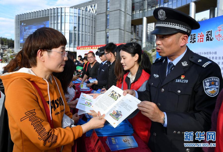 福建省福州市永泰縣公安干警在掃黑除惡專項(xiàng)斗爭(zhēng)宣傳活動(dòng)上向群眾介紹專項(xiàng)斗爭(zhēng)成果(2020年1月6日攝)。新華社記者 張國(guó)俊 攝