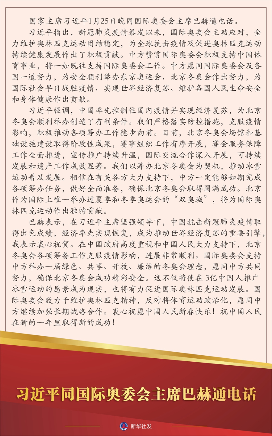 新華社北京1月25日電 國(guó)家主席習(xí)近平1月25日晚同國(guó)際奧委會(huì)主席巴赫通電話。