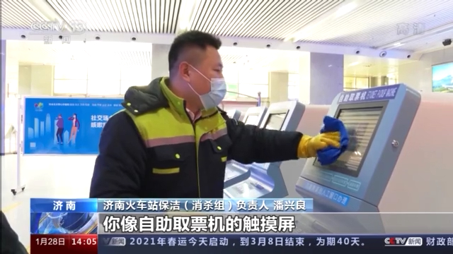 濟南火車站保潔(消殺組)負責人 潘興良:你像自助取票機的觸摸屏、電梯的扶手帶,包括水龍頭開關(guān),旅客使用比較頻繁,所以由原來的兩小時一次消毒改為現(xiàn)在的一小時一次消毒。