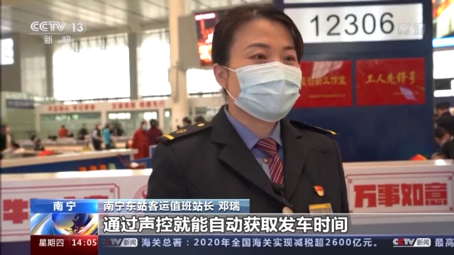 南寧東站客運值班站長 鄧瑞:我們配備6臺12306智能客服機,使用時無需接觸,通過聲控就能自動獲取發(fā)車時間、發(fā)車時長、檢票口位置等信息。