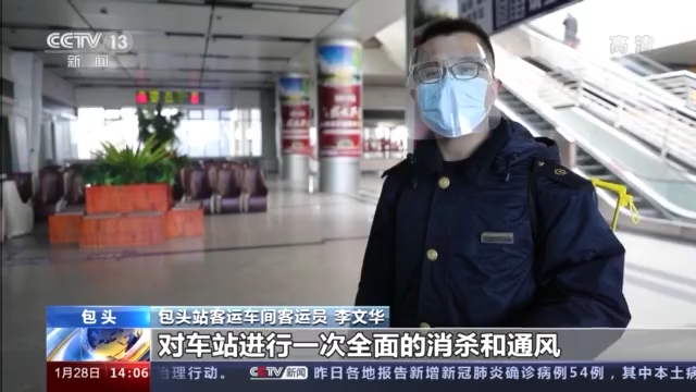 包頭站客運車間客運員 李文華:我們現(xiàn)在是每3小時對車站進行一次全面的消殺和通風,對驗票的閘機、電茶爐、洗手池面臺、衛(wèi)生間進行擦拭消毒,對候車室的地面和進出站通道噴灑稀釋后的消毒液。
