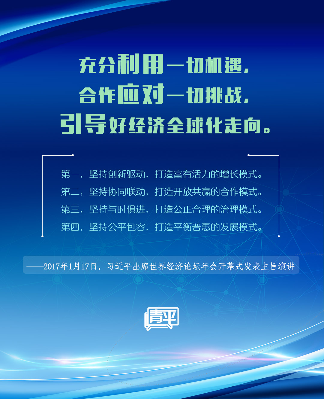 2017年,習(xí)近平主席出席世界經(jīng)濟(jì)論壇年會(huì)開幕式,并發(fā)表題為《共擔(dān)時(shí)代責(zé)任 共促全球發(fā)展》的主旨演講,在全球化遭遇逆流,單邊主義、保護(hù)主義抬頭之時(shí),指明經(jīng)濟(jì)全球化的發(fā)展方向,表明了中國推動(dòng)經(jīng)濟(jì)全球化的堅(jiān)定立場。
