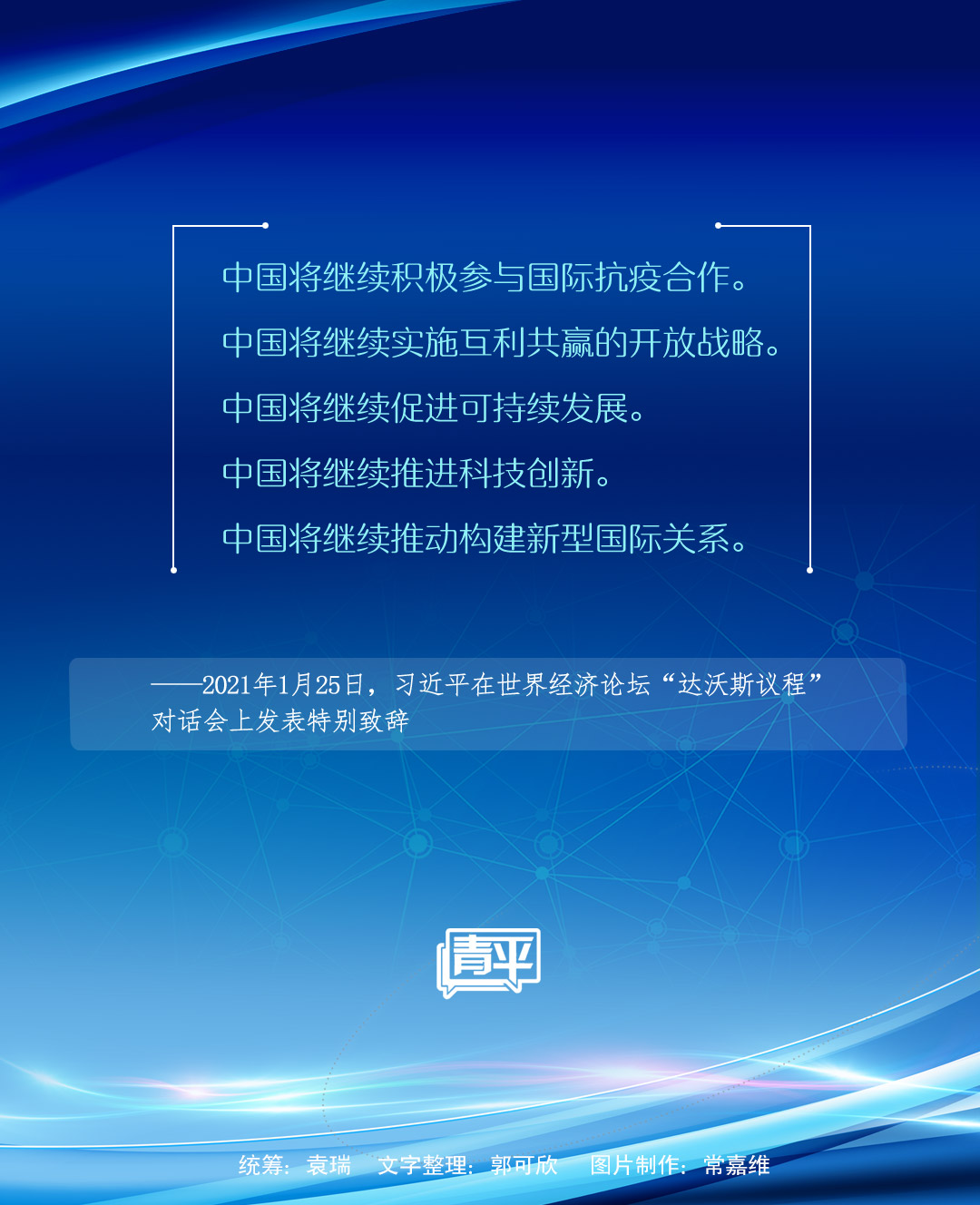 1月25日晚,國家主席習(xí)近平在北京以視頻方式出席世界經(jīng)濟(jì)論壇“達(dá)沃斯議程”對(duì)話會(huì)并發(fā)表特別致辭。