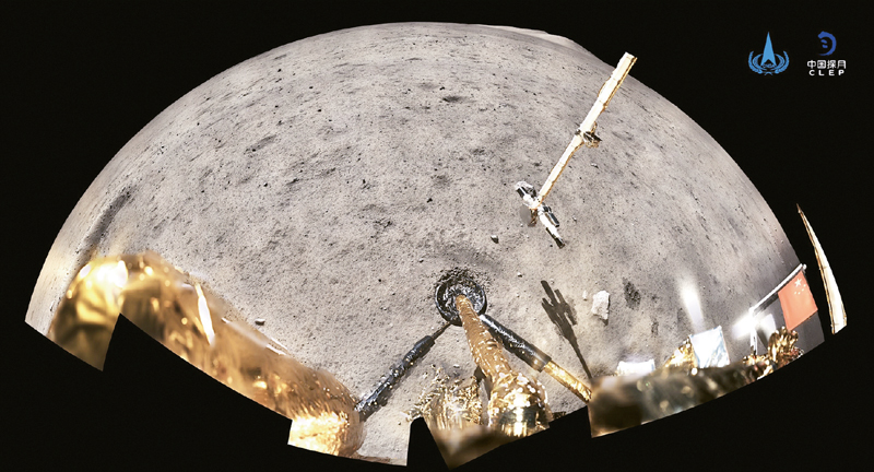 2020年12月4日,國家航天局公布了探月工程嫦娥五號探測器在月球表面國旗展示的照片。嫦娥五號著陸器和上升器組合體全景相機(jī)環(huán)拍成像,五星紅旗在月面成功展開,此外圖像上方可見已完成表取采樣的機(jī)械臂及采樣器。 新華社發(fā)(國家航天局供圖)