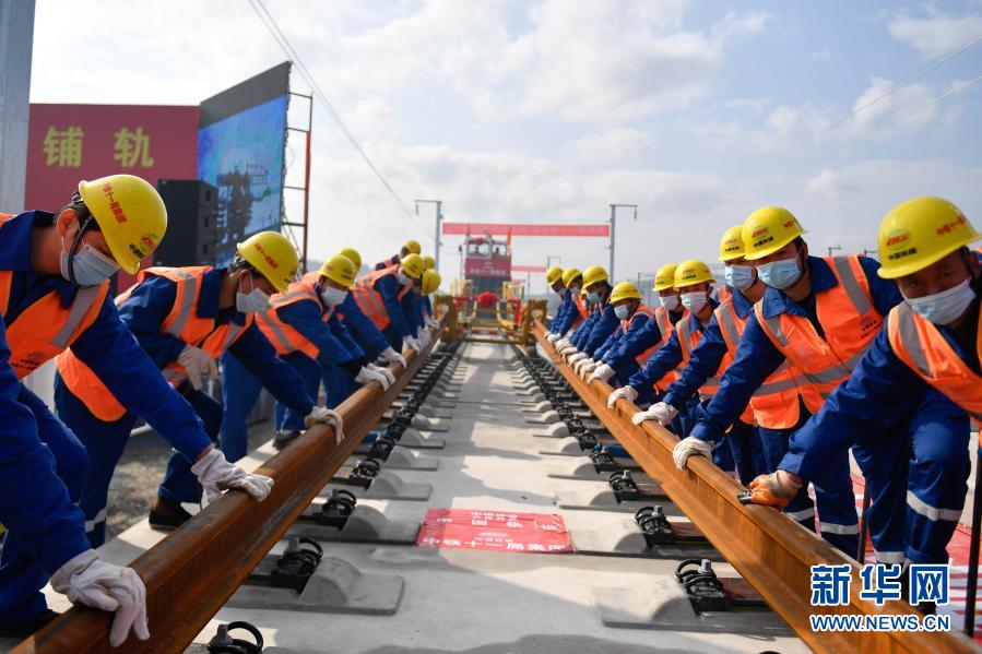 當日,在浙江臨海的杭紹臺鐵路建設施工現(xiàn)場,首對500米長鋼軌被安全平穩(wěn)地鋪設到無砟軌道道床上,標志著杭紹臺鐵路工程轉入全線鋪軌階段。