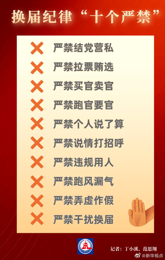 《通知》規(guī)定,要嚴明換屆紀律,堅決維護換屆工作嚴肅性。一是嚴禁結(jié)黨營私,對拉幫結(jié)派、上下勾聯(lián)、搞團團伙伙和小圈子的,以人劃線、任人唯親、排斥異己的,培植個人勢力、結(jié)成利益集團的,一律給予黨紀政務處分。二是嚴禁拉票賄選,對通過宴請、安排消費活動,快遞郵寄、電子紅包、網(wǎng)上轉(zhuǎn)賬等方式贈送禮品禮金,以及打電話、發(fā)信息、當面拜訪、委托他人出面等形式,在民主推薦和選舉中搞拉票、串聯(lián)、助選等非組織活動的,一律排除出人選名單或者取消候選人資格,并視情節(jié)輕重給予黨紀政務處分,賄選的依法處理。三是嚴禁買官賣官,對以謀取職務、提高職級待遇等為目的賄賂他人的,通過幫助他人謀取職務、提高職級待遇索取、收受賄賂的,一律先停職或者免職,并依規(guī)依紀依法處理。四是嚴禁跑官要官,對采取拉關系或者要挾等手段謀取職務、提高職級待遇的,一律不得提拔或者進一步使用,并視情節(jié)輕重給予批評教育、組織處理或者黨紀政務處分。五是嚴禁個人說了算,對以個人決定代替黨組織集體研究決定的,授意、暗示、指定提拔調(diào)整人選的,一律取消相關任用決定,并嚴肅追究相關領導和有關人員責任。六是嚴禁說情打招呼,對為他人推薦提名、提拔調(diào)整疏通關系的,違規(guī)干預下級或者原任職地區(qū)和單位干部選拔任用的,一律作為領導干部違規(guī)插手干預重大事項的情形記錄在案,并視情節(jié)輕重給予批評教育、組織處理或者黨紀政務處分。七是嚴禁違規(guī)用人,對借換屆之機突擊提拔調(diào)整干部、超職數(shù)配備干部、違反規(guī)定程序選拔任用干部的,一律宣布無效,并對相關人員依規(guī)依紀進行處理。八是嚴禁跑風漏氣,對泄露、擴散換屆人事安排等保密信息的,一律追究相關人員責任。九是嚴禁弄虛作假,對篡改、偽造干部人事檔案材料的,在換屆考察工作中隱瞞或者歪曲事實真相的,一律予以糾正,并視情節(jié)輕重對相關人員給予組織處理或者黨紀政務處分。十是嚴禁干擾換屆,對境內(nèi)外敵對勢力攪擾破壞換屆的,嚴加防范、堅決打擊;對黑惡勢力、家族勢力、宗教勢力干擾影響換屆選舉的,違規(guī)接受境外機構(gòu)、組織、個人提供資助或者培訓的,以威脅、欺騙、利誘等手段妨害他人自由行使選舉權(quán)的,造謠誹謗、誣告陷害或者打擊報復他人的,一律嚴厲查處,涉嫌違法犯罪的依法追究法律責任。