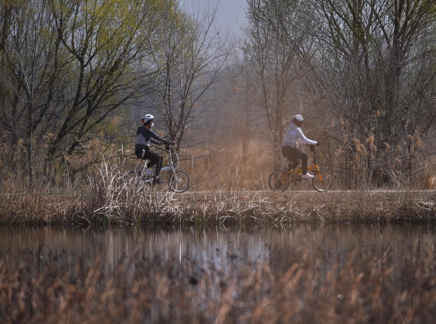2020年4月5日,游人在北京延慶野鴨湖國家濕地公園里騎行。新華社記者 陳鐘昊 攝