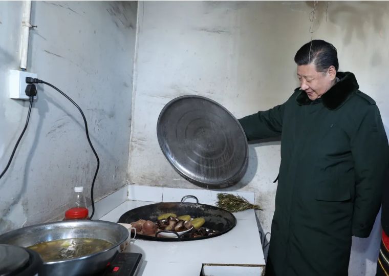 ↑2013年2月3日,習近平在甘肅臨夏回族自治州東鄉(xiāng)族自治縣布楞溝村村民馬麥志家,和一家人聊家常。